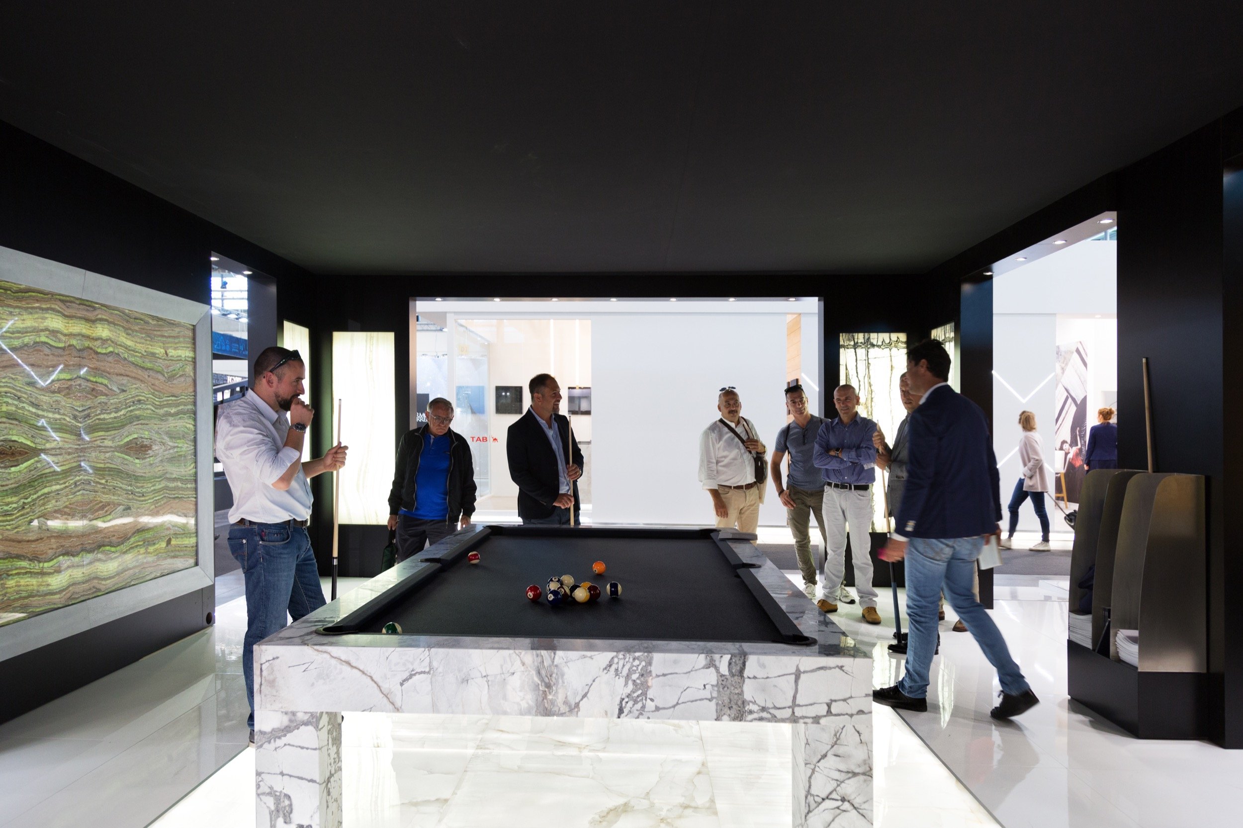 In addition to the marble pool table and slabs on show, the award-winning exhibition also includes our Hydra bathtub, in Elegant Gray marble and extra-clear glass. Sinuous shapes that gently accompany the eye from the curves of the tub, to the shower tray and then to the wall, where all items are integrated into a system that divides the space in two.